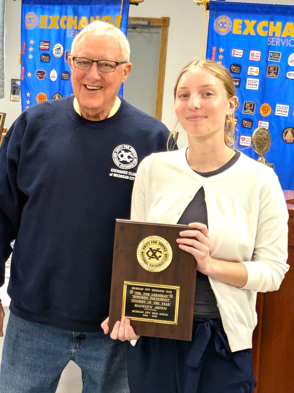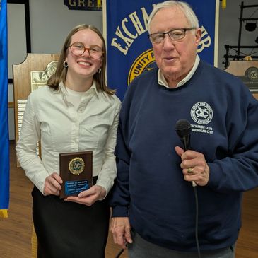 Congratulations to Madelyn Shinn, from Michigan City High School, who has won the coveted Exchange Club Indiana Student of the Year Award. Madelyn previously earned the Michigan City Exchange Club Student of the Year honor, which qualified her for the State event. She was chosen for her Exceptional Academic Abilities, Activities, Community Service and Personal Achievement. She wrote a thought provoking essay which provided background for her decision to pursue a medical career. The judges stated it was the best they had ever seen. Madelyn received a $ 1,500 prize to help with the cost of her education. Victory over contestants from 16 other Exchange Clubs in Indiana, qualifies her for consideration as the Exchange Club National Student of the Year.